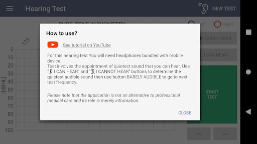 Questa app non è un'apparecchiatura medica o un software con certificazione medica speciale. Non sostituisce un esame dell'udito condotto da uno specialista. I risultati del test dell'udito in questa app non possono essere utilizzati come base per la diagnosi medica.