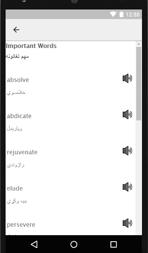 Learn English words from Pashto. English Vocabulary is a great asset to keep and harness. Learn English vocabulary in Pashto using audio. Get the confidence to speak English words using this English Word book. After learning these English words, you can take the first step towards learning Spoken English.