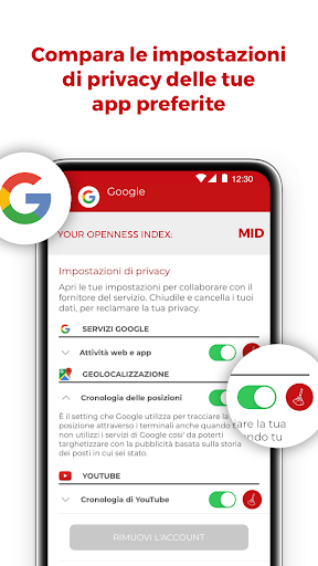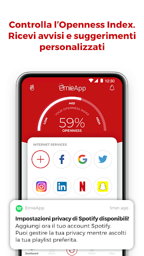 Controlla in tempo reale il livello di privacy che hai scelto sui servizi che usi più frequentemente: lo puoi fare tramite l’Openess Index che compare in dashboard se hai aggiunto almeno un account. Ogni user ha il suo, personalizzato, in tempo reale.