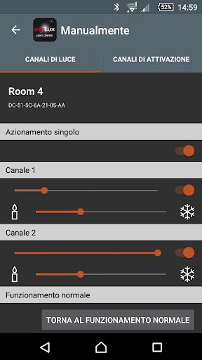 - impostazione manuale di luminosità e colore della luce, complessivamente per tutti i canali o per il singolo canale di luce