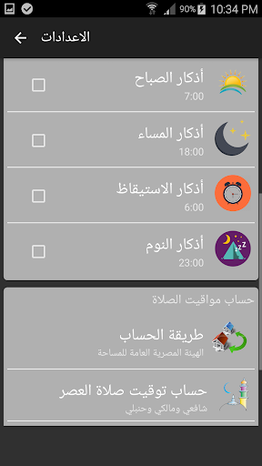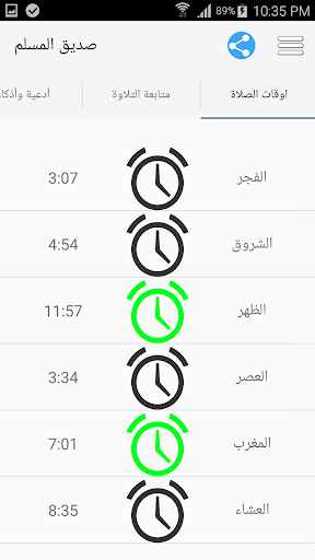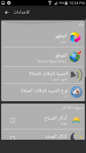 - يمكن التطبيق المستخدم من معرفة اوقات الصلاة عن طريق تحديد مكانه اما تلقئياً او يدوياً باختيار المدينة ويتيح التطبيق الاعدادات المختلفة في حساب اوقات الصلاة ... ويمكن التطبيق المستخدم امكانية التنبيه لأوقات الصلاة اما عن طريق رسالة او تشغيل الأذان حسب رغبة المستخدم ..