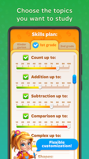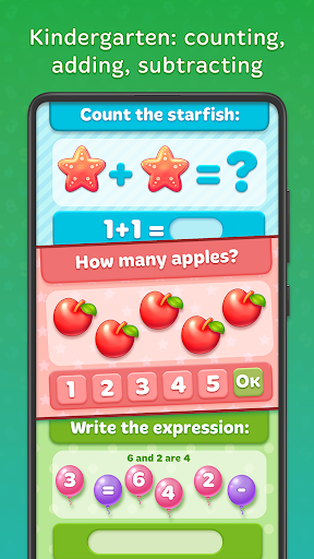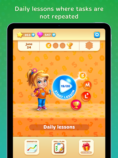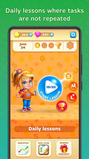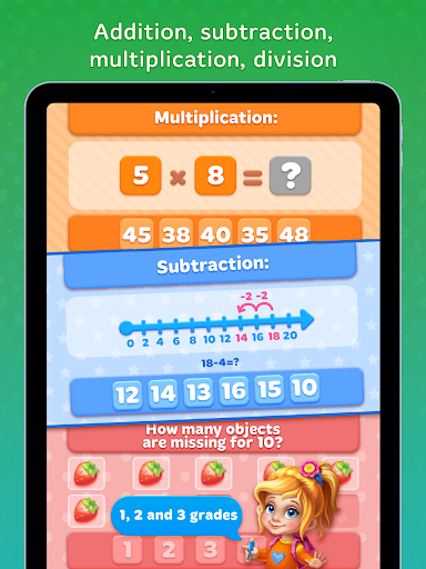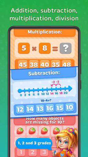 in una modalità di gioco quando tuo figlio gioca a dozzine di mini giochi e impara la matematica in modi divertenti.L'istruzione inizia da cose aritmetiche e fondamentali.Prima di