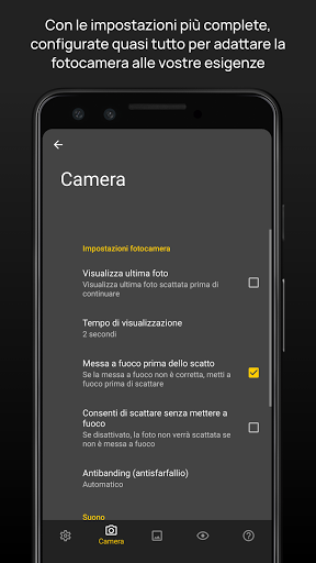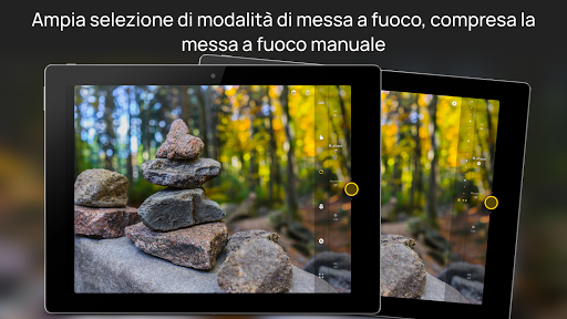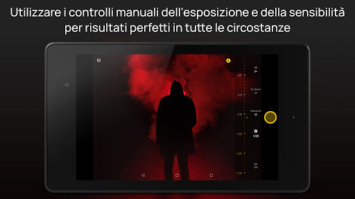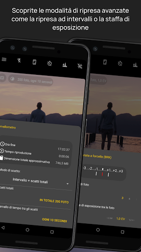 (1) Richiede un dispositivo compatibile, con Android 5 e l'implementazione di Camera2. L'intervallo di tempo di esposizione varia a seconda dei dispositivi, il massimo di 60 secondi è supportato solo in una manciata di dispositivi. Compatibile anche con specifici dispositivi più vecchi. Su dispositivi non compatibili, viene utilizzata un'implementazione alternativa, con utilizza una risoluzione inferiore. La modalità di esposizione sintetica simile è disponibile anche su tutti i dispositivi. Ulteriori informazioni sulle FAQ: http://www.camerafv5.com/faq/
