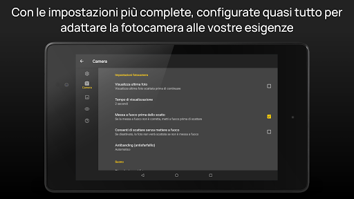 ● Molte funzioni della fotocamera assegnabili ai tasti del volume (otturatore, messa a fuoco, compensazione dell'esposizione, zoom, fotocamera successiva/precedente, bilanciamento del bianco...).