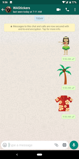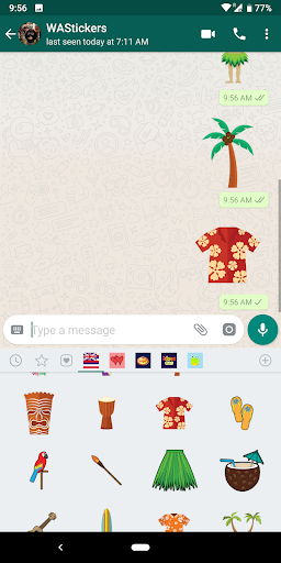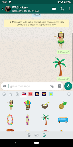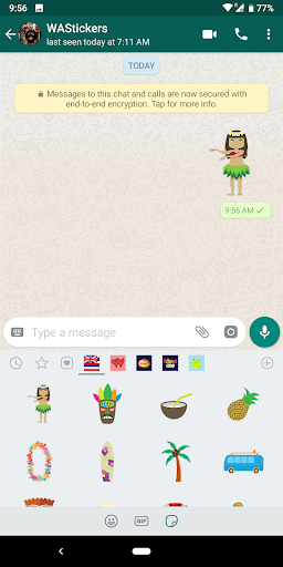 Quindi apri una chat whatsapp ™ , Basta toccare il nuovo pulsante adesivo e selezionare l'adesivo che si desidera condividere. È possibile aggiungere nuovi pacchetti adesivi toccando l'icona Plus.