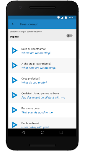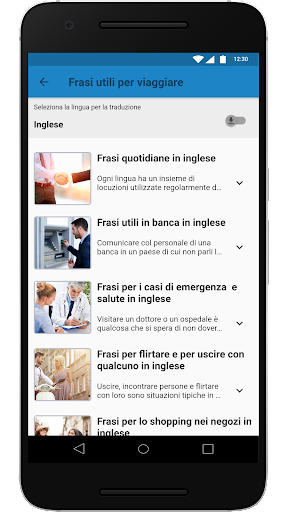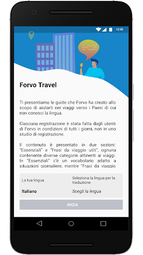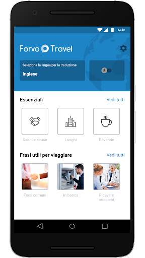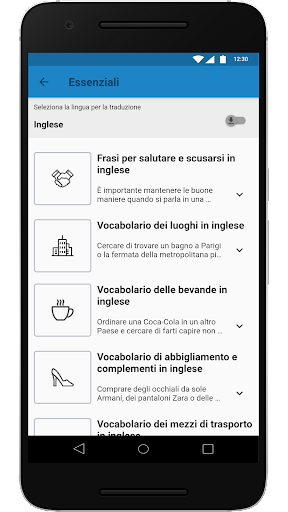 Il contenuto è presentato in due sezioni: “Essenziali” e “Frasi da viaggio utili”, ognuna contenente diverse categorie attinenti ai viaggi. In “Essenziali” c’è un vocabolario adatto a situazioni giornaliere, mentre “Frasi da viaggio utili” contiene frasi che possono essere d’aiuto in particolari situazioni.