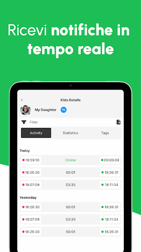 Vuoi essere sicuro che i tuoi figli stiano bene? O vuoi controllare quanto tempo trascorrono sulle app di messaggistica? Tieni traccia delle loro attività online/offline in tempo reale con le notifiche push.