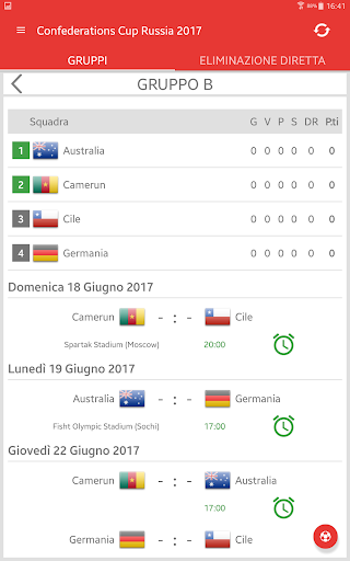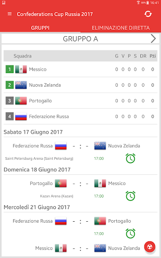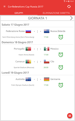 Risultati per FIFA Confederations Cup Russia 2017 è l'applicazione che ti permetterà di seguire le partite del torneo internazionale di calcio maschile in Russia, anche se non hai la possibilità di guardare la TV o il flusso in diretta. Esso include un calendario delle partite, tabella di gruppo, risultati in diretta e determina in se stesso quali squadre si qualificheranno alla fase di eliminazione. Con l'applicazione non perdere un Gol o inizio di una partita, perché ti invierà un push-notifiche. Puoi selezionare le partite preferite e ricevere notifiche solo per loro. Nella Confederations Cup 2017 gioca le squadre: Russia, Germania, Australia, Cile, Messico, Nuova Zelanda, Portogallo e Camerun.
