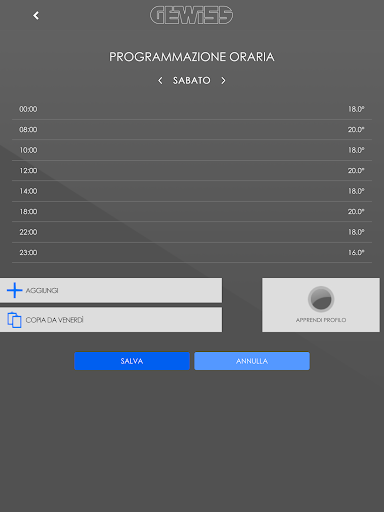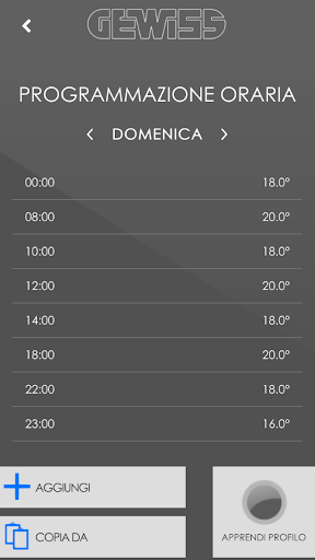 Con la APP è possibile programmare il profilo di temperatura di ogni giorno della settimana in modo da pianificare la temperatura desiderata in ogni istante della giornata o attivare la funzione di autoapprendimento che, dopo avere appreso le tue abitudini, può generare il profilo in modo automatico.