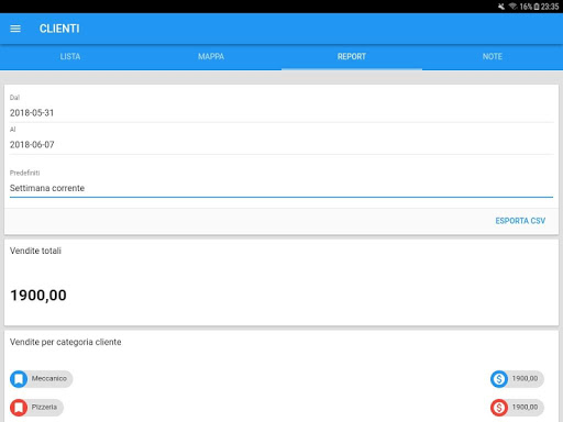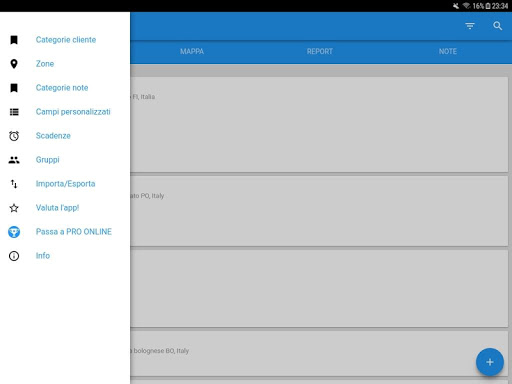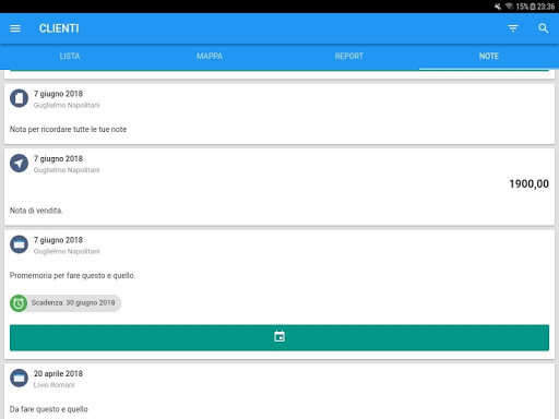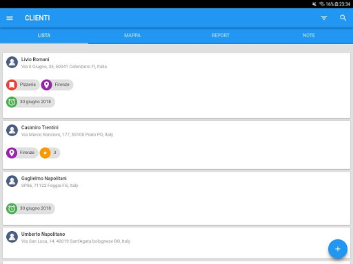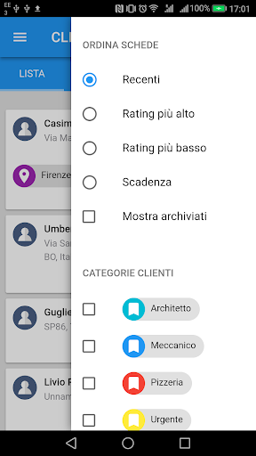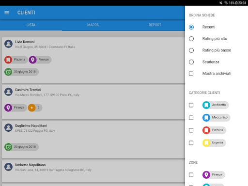 Puoi assegnare categorie ai tuoi clienti e/o suddividerli per zone geografiche. Puoi ricercare i clienti, ordinarli per scadenza e priorità, filtrarli per categorie e zone.