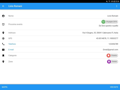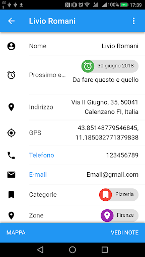 Per ogni cliente vengono mostrati solo i campi che hai inserito mantenendo così la scheda pulita ed essenziale. Puoi inserire un cliente anche sul posto e in un click l'app imposterà per te la posizione esatta sulla mappa e l'indirizzo