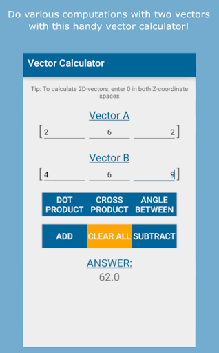 If you want this app with added functionality and a slick, new design, please consider purchasing Vector Calculator Plus, here on the Play Store! It can be found under my dev name
