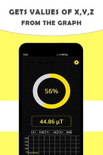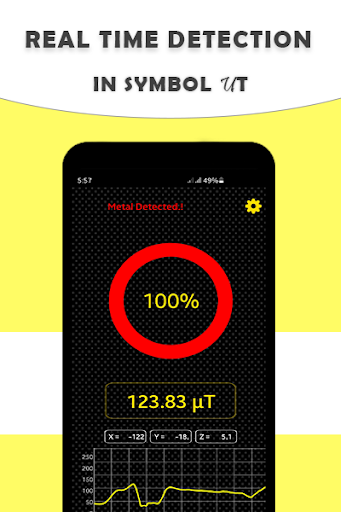 Quando la schermata Metal Finder si apre c'è un interfaccia utente di esempio in cui include i valori in tempo reale di XYZ e il rilevamento in μt una barra di avanzamento in cui viene rilevato il metallo. Il colore della barra è rosso e la notifica mostra che il metallo è stato rilevato.
