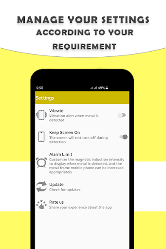 Questa app funziona come un rilevatore intelligente in cui viene rilevato il metallo, il dispositivo Android inizia la vibrazione. Alcune altre istruzioni sono mentre l'utilizzo dell'App Metal e Gold Detector è quella che posiziona oggetti metallici sul retro.