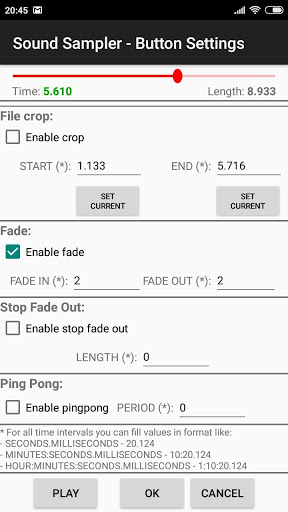 - Stop fade out - imposta la dissolvenza in chiusura all'arresto del suono. Imposta la lunghezza della dissolvenza in uscita.