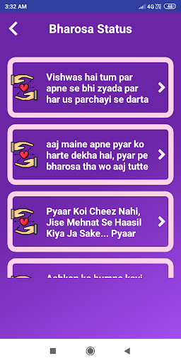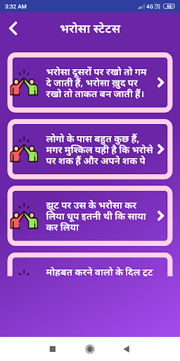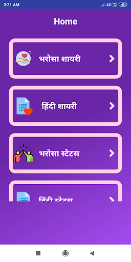 Bharosa Shayari Status App è un'applicazionecategorie come hindi, inglese e altro.