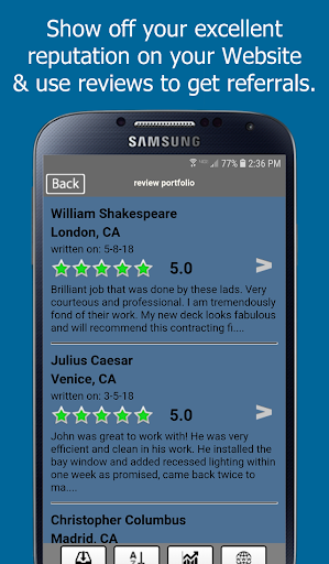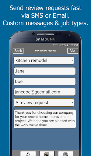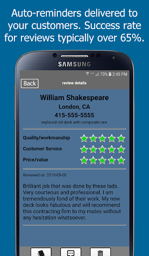 With a strong review portfolio, your business will gain an important edge when bidding on new jobs. Within seconds from your Android phone, you’ll be able to TEXT or EMAIL your entire review portfolio to prospects and provide them with proof of your skills, trustworthiness, and value.