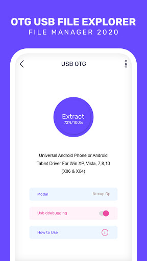OTG File Manager: l'accesso root non è richiesto. È possibile trovare il driver USB Android per PC da oltre 800 produttori di telefoni cellulari come Samsung, LG o Sony, ecc ..., supportati per Windows XP, Vista, 7, 8, 10. USB OTG File Manager App consente di Leggi le unità flash USB e i lettori di carte con telefono e tablet. È necessario collegare l'unità flash a un cavo OTG (On-the-Go), quindi avviare l'app OTG USB File Explorer e potrai vedere tutti i file per accedere a Drivce USB. Così come i lettori di carte dal tuo telefono o tablet. Collega il connettore Micro USB del tablet con l'utilizzo di OTG USB Explorer Application. Il driver USB OTG per Android ti offre di usare USB un'opportunità di strisciare azionamenti. USB OTG Checker semplifica la prova se il telefono è compatibile con i dispositivi USB OTG. OTG o sui dispositivi GO USB sono dispositivi che possono essere utilizzati sulla porta USB del dispositivo tramite un cavo USB OTG adatto.