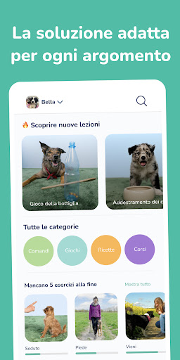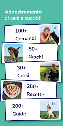 Scopri un'ampia gamma di comandi, giochi e ricette per cani. Trova ispirazione per la tua prossima sessione di addestramento e divertiti insieme. In questa app, puoi trovare ad esempio questi temi di corsi: Comandi di base, Nozioni di base per cuccioli (Passeggiare con il cucciolo, Addestramento al vasino, Inibizione del morso, Nutrizione per cuccioli, Giochi per cuccioli, Comandi per cuccioli), Addestramento al guinzaglio, Masterclass sul richiamo, Come ignorare altri cani durante le passeggiate, Come comportarsi durante una visita, Corso col clicker, Guida al controllo degli impulsi del cane, Controllo della salute a casa, Dieta a base di cibo crudo, Addestramento alla museruola, Tranquillità in ufficio, Addestramento per Capodanno, Fermare il tuo cane dal mangiare cose a caso, Addestramento anti-abbaio o Corso su come restare soli per i cani.