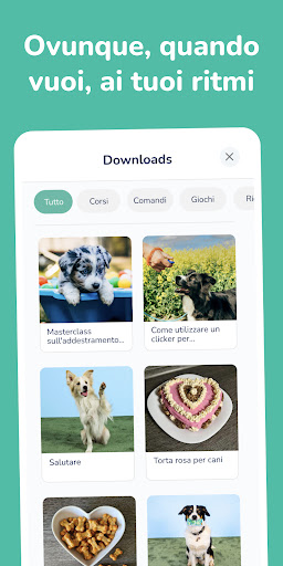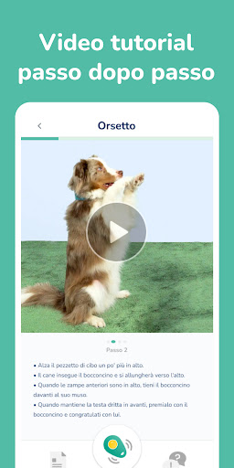 Ti guidiamo verso il tuo obiettivo con i nostri tutorial video interattivi. I tutorial sono progettati in modo che tu possa avere successo con soli 5 minuti di addestramento al giorno. Ti ricorda del tuo addestramento e quando ti alleni con successo, ottieni un fantastico trofeo per la tua bacheca virtuale. Oltre ai metodi di addestramento per cani, troverai anche fantastiche attività sotto forma di giochi per animali domestici e ricette.