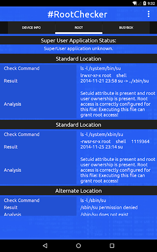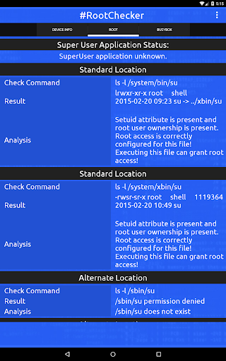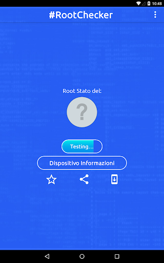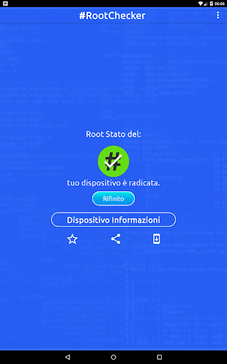 Root Checker controlla il ROOT (SuperSu) Stato del dispositivo Android. Non sarà sradicare o installare superuser (SU) biblioteca. RADICAZIONE permette agli utenti di ottenere il controllo privilegiato (noto come "l'accesso root"). Dopo aver controllato lo stato di root è possibile condividere via Facebook, Twitter e altre applicazioni.
