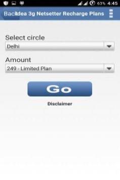 Idea 3g Netsetter Recharge Plans app provides details about various Idea 3g Data Card Recharge plans available in various States of India. Users select the State and Amount to get the Recharge plans details. Idea 3g netsetter data card recharge plans provides details of recharge plans of various data packages of idea 3g netsetter data card offered in various states of India.
