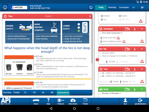 If you need to check your individual checklists, analyze the damages on the outer cover, record all the tire data, calculate the expected repair costs and extend the customer order by the touch of a button.