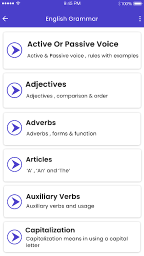 La grammatica inglese spiegherà grammaticamente, corretta grammatica inglese, la comprensione più chiara delle classi di grammatica. L'app Grammark Simplistic Approck Applicazione di grammatica APPS Fornire 25 kart testi, test inglese, libro di grammatica inglese, corsi di grammatica online nuove abilità.