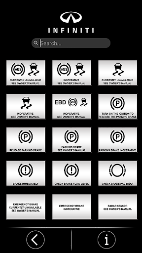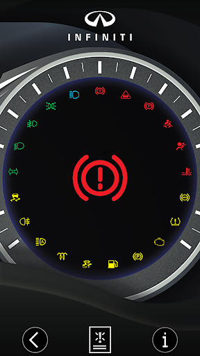 “Quando sul quadro strumenti del veicolo viene visualizzata una spia di avvertimento, la Guida per il conducente INFINITI provvede a fornire un rapido accesso alle informazioni supplementari.”