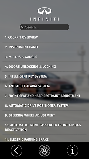 La Guida per il conducente INFINITI è un'applicazione basata sulla Tecnologia della Realtà Aumentata, ossia la Augmented Reality Technology. È un aiuto per chi desidera imparare a usare e capire meglio il proprio veicolo.