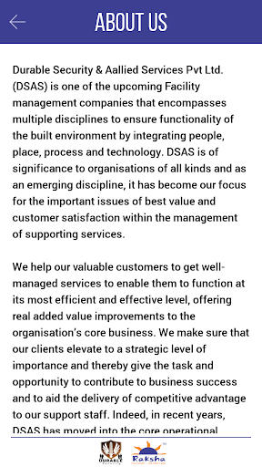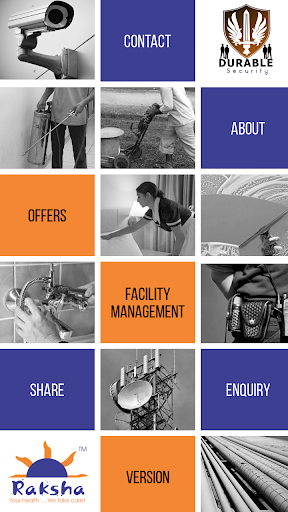 By downloading this app, you can effortlessly browse through the exclusive Facility Management services offered by Durable Security and Raksha, on the move! Furthermore, you can send immediate enquiry, right from your Smartphone, with a few tap.