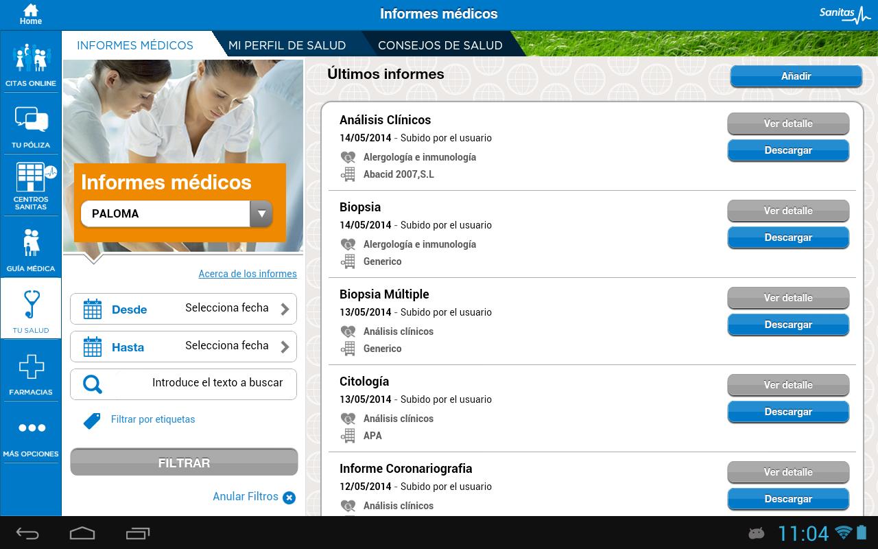 Acceso a tus informes médicos en el área “Tu salud”. Posibilidad de descargar pruebas realizadas en los centros de Sanitas y subir tus propios informes.