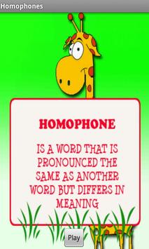 A homophone is a word that is pronounced the same as another word but differs in meaning. A couple of examples are "sun" and "son" and "eight" and "ate." This app contains 35 such words, with beautiful pictures that make it interesting and attractive for kids.