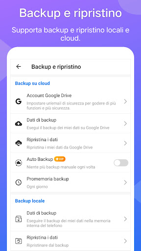 - Supporta backup e ripristino locali e cloud.