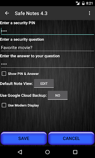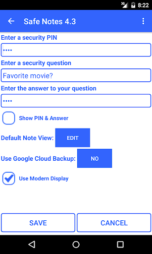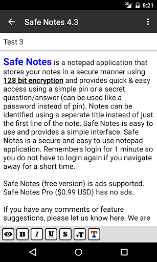 Safe Notes è un'applicazione notePad che memorizza le note in modo sicuro utilizzando la crittografia a 128 bit e fornisce un accesso rapido e facile utilizzando un semplice numero di PIN o una domanda / risposta segreta (può essere utilizzato come una password anziché PIN). Le note possono essere identificate utilizzando un titolo separato invece della prima linea della nota. Le note sicure memorizza tutti i tuoi dati sul dispositivo invece di caricare le tue informazioni personali su Internet. Le note sicure sono facili da usare e fornisce un'interfaccia semplice. Le note sicure sono un'applicazione per il blocco note sicura e facile da usare.
