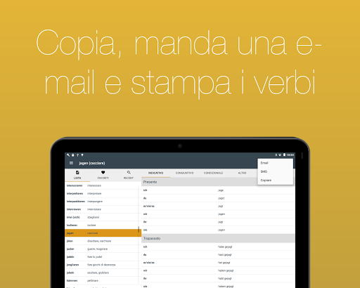 Include la possibilità di copiare, inviare tramite e-mail e stampare i verbi.