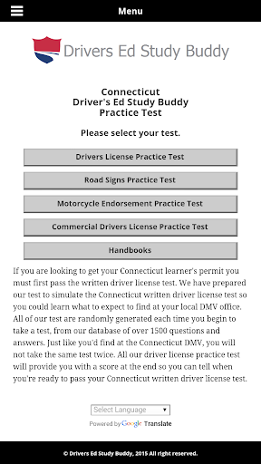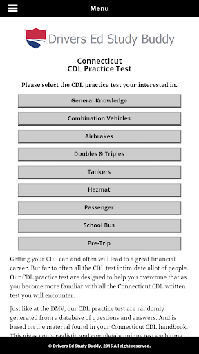 Drivers Ed Study Buddy's Connecticut driver license test, provides unlimited free driver license practice test from a pool of over 1500 test questions. Our Connecticut driver license test provides you with realistic test scores so you'll know when you're ready to take your written test. All of our Connecticut driver license test are randomly generated (just like at the DMV) each time you begin a test insuring you know the information needed to pass your test and not just memorized some questions. This helps you become more familiar with the test and helps you figure out where you may need to study more.