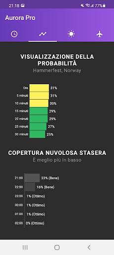- Previsioni per la prossima ora, diverse ore e diverse settimane in modo da poter pianificare la visione dell'aurora boreale con molto anticipo (in base alle condizioni meteorologiche).