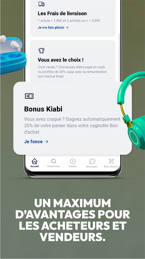 Un exemple ? Vendez un jean Levi’s 10€ : choisissez de recevoir 12€ dans votre cagnotte BON D’ACHAT Kiabi. (Prix de l’article 10 € + 20 % = 12€ en Bon d’achat Kiabi) ou bien 10€ dans votre cagnotte CASH.
