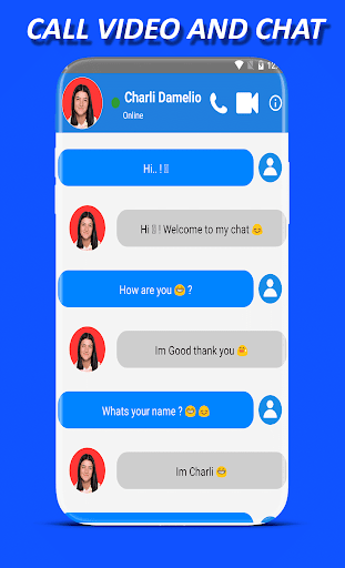 Charli D'amelio fake video call is a simple application is very profissionel application to make call video with your hero Charli D'amelio chat call and fake video call with a simple live chat, Enjoy calling Charli D'amelio chat in an easy way, feel free and download this Charli D'amelio video call for have fun with friend. Charli D'amelio video Call, Today you can prank your friends and joke with them, Connect to Charli D'amelio fake chat by clicking on the fake chat button and have fun with Charli D'amelio call with your friends.
