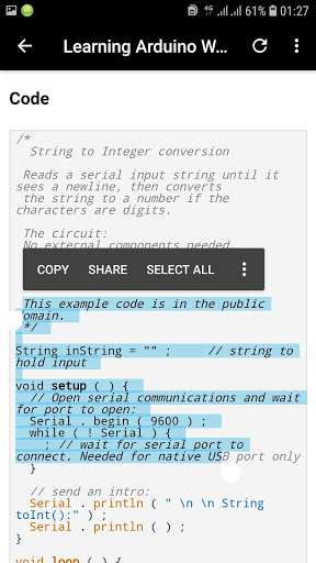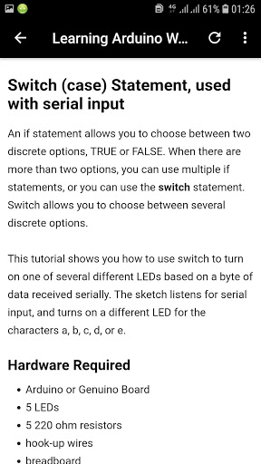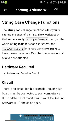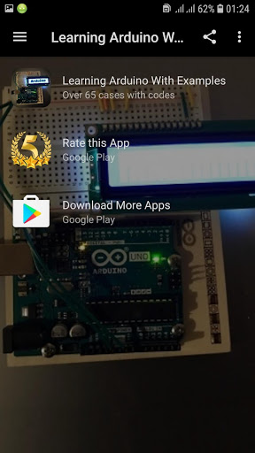 Learn Arduino With Examples app teaches you basic concepts about Arduino using suitable examples. Arduino consists of both a physical programmable circuit board as well as a software, or IDE (Integrated Development Environment) that runs on your computer, which can be used to write & upload computer code to the physical board.