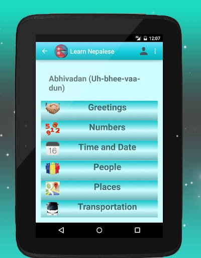 Questa app è progettata per scopi di conversazione non per scritti, quindi si concentra solo su come pronunciare parole nepalesi, senza concentrarsi su come scrivere alfabeti e script nepalese. Quindi, quando viaggi in Nepal e sei in un negozio o in un ristorante dove non sono in grado di comunicare con te in inglese, puoi impressionarli parlando nepalese e costruendo la tua fiducia. Sia che tu stia viaggiando in Nepal o che tu voglia parlare nepalese con i tuoi amici nepalese, questo potrebbe essere il tuo buon amico a guidarti.