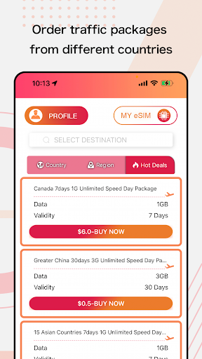 Questa applicazione è un software che integra le funzioni della gestione dei dispositivi wireless e del centro commerciale.È possibile ordinare pacchetti ESIM da più paesi nell'applicazione o scaricare i pacchetti ordinati sul dispositivo associato dopo l'ordinazione e gestire/cambiare i pacchetti nel dispositivo.Allo stesso tempo, puoi anche scaricare e gestire i pacchetti di traffico ordinati altrove per il tuo dispositivo.