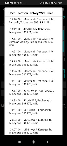 cronologia del viaggio: visualizzazione della cronologia della posizione dell'utente con tempo e massimo , Velocità media e durata e distanza in chilometri.