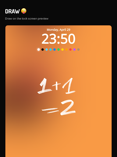 Stai cercando un metodo distintivo per creare sfondi a schermo di blocco e condividerli con amici e persone care?Scopri il disegno a serio - Disegna su un blocco schermo, un blocco - Applicazione di disegno a schermo di blocco realizzato per accendere la creatività tra amici e coppie.Progetta un paio di sfondi e usali come sfondo della schermata di blocco.Sblocca la tua creatività con la possibilità di disegnare direttamente sulla schermata di blocco.gradienti fatti