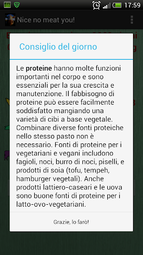 Completano l'applicazione la possibilità di visualizzare un "Consiglio del giorno" e un "Calendario stagionale di frutta e verdura", due aiuti quotidiani per la tua dieta veggie.