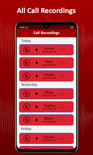 Call Recorder Offline 2021 - Record Phone Calls app has very simple and smooth working. Open our easy call recording app and you will have very understandable layout. You will have three categories of recordings available in this call recorder 2021. You can choose any category from all recordings, incoming and outgoing. You will have all the recordings of your contacts in this call recording HD. All the recordings will be present with the name and number of your contact for easy access within this auto call recorder. You can also select our required recording and click to play it with audio player in this call recording new. Recordings will be saved with high quality sound. Call recorder free app will also provide you other features like recording duration, start and end time and etc. You can share these recordings on social media with friends and family.