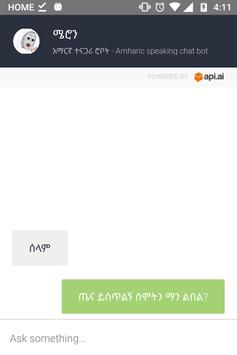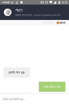 The bot's name is ሜሮን / Meron, she is new to Amharic but she tries her best to handle conversations in Amharic. She is still under experimental stage but the more you talk to her the smarter she gets. Her ultimate goal is to understand your intent and provide you appropriate answers to your questions. Be nice to her!