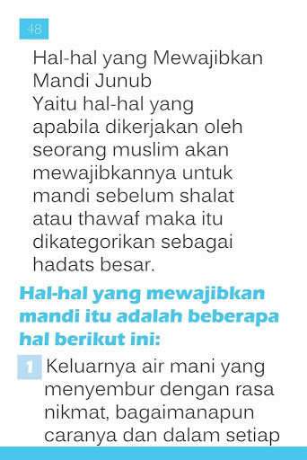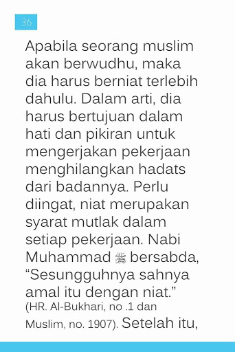Aplikasi ini menampilkan pengenalan tentang urgensi bersuci dalam kehidupan seorang Muslim. Juga disertai penjelasan tentang makna bersuci dan kondisi berhadats (tidak suci) dan bagaimana seorang Muslim membersihkan diri dari najis. Dijelaskan pula tentang tata cara wudhu dan hukum-hukum yang berkaitan dengan bersuci dengan cara yang menarik dan mudah.