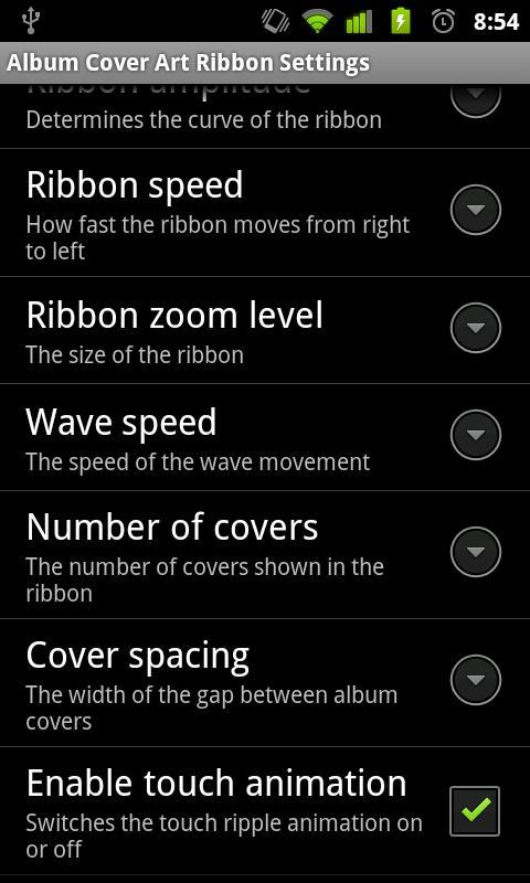 This live wallpaper uses cover art from your music collection and animates them in the background. It uses OpenGL graphics for the best performance. The ribbon is fully customizable through these options: